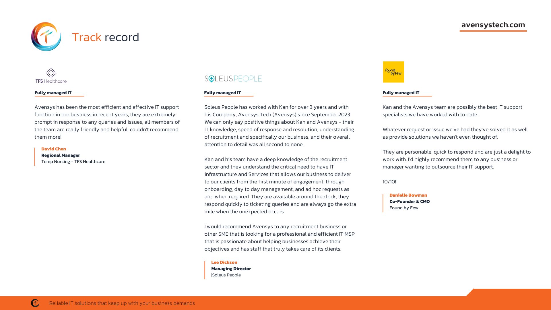 Kan and the team have been a breath of fresh air. With extensive knowledge of the recruitment market, they offer a fantastic end to end service with our IT systems, ensuring no stone is left unturned and always at the end of a support ticket if we need any additional help. The team are very fast to react, patient and knowledgeable not only help to fix any issues we may be facing, but explaining to us in depth how what they have done, and if there is any way we can complete the task without their guidance to up skill ourselves. I would definitely recommend the Avensys Tech team to any SME looking for a reliable, honest IT MSP.