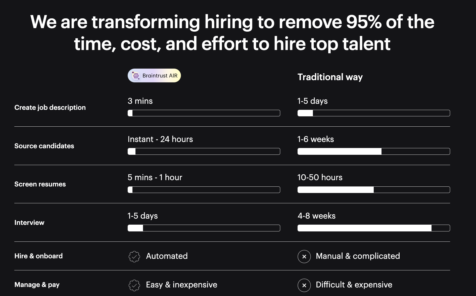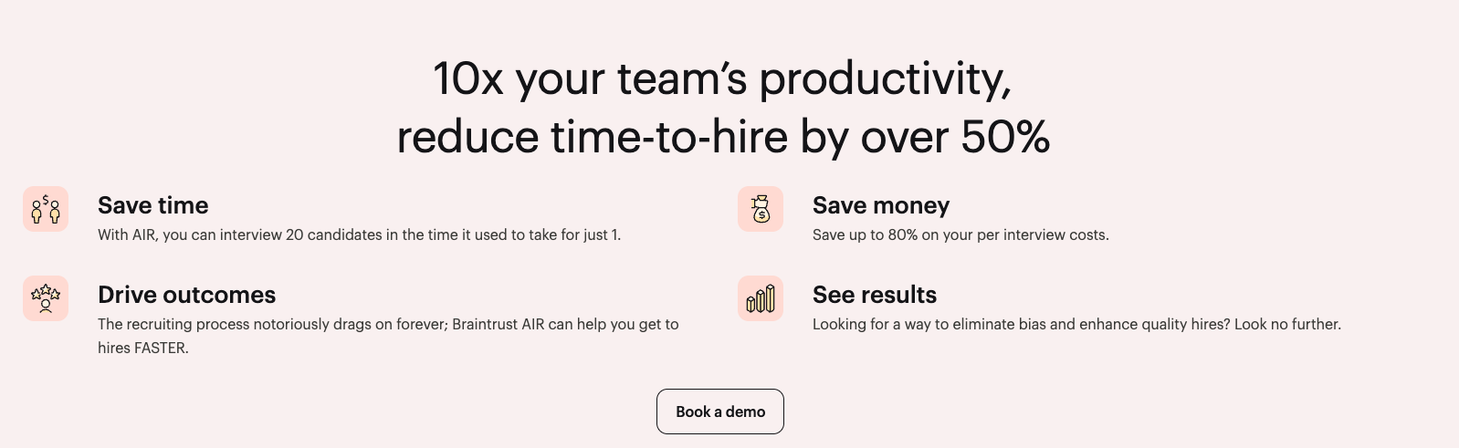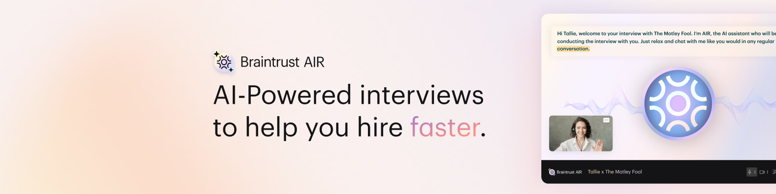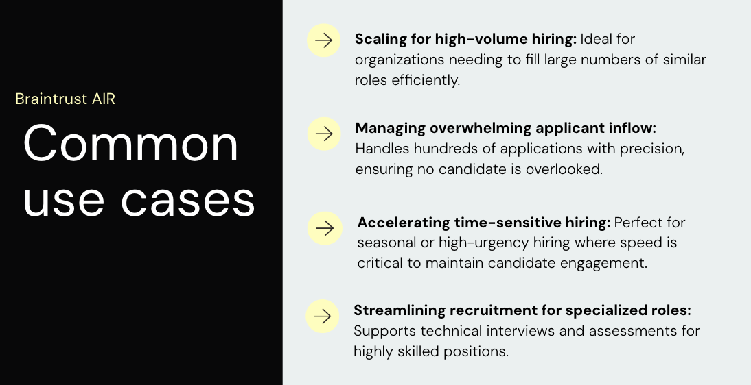 Braintrust AIR is an AI-powered interview platform revolutionizing how companies hire at scale. Built for speed, fairness, and efficiency, AIR automates the first-round interview process—scoring candidates instantly with structured, unbiased assessments. We work with leading organizations to streamline hiring across healthcare, staffing, tech, and retail, reducing recruiter workload by up to 80%, cutting time-to-hire by 50%, and saving clients millions annually.