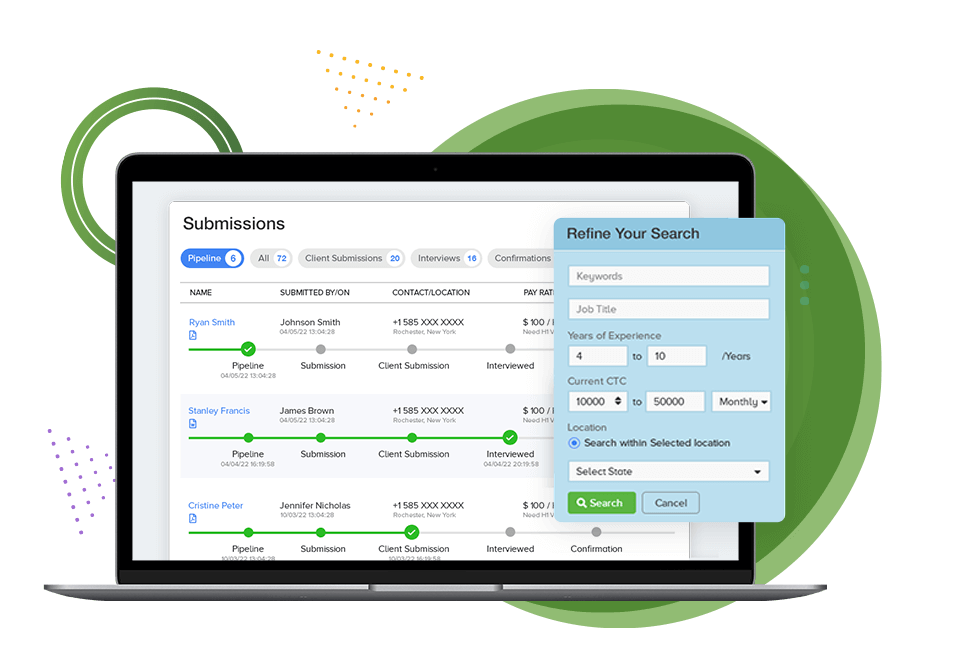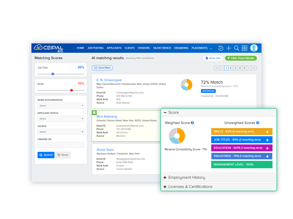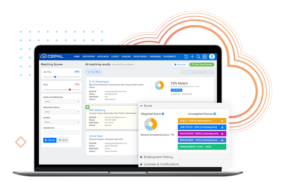 CEIPAL equips recruiters with tools to double their number of placements using less time, for less money. Leveraging today’s modern search engines and advanced analytics, CEIPAL delivers hundreds of high-quality candidates straight to a recruiter’s dashboard. And, using the power of AI, CEIPAL provides data-driven recommendations for each job opening, helping you find the perfect candidate in a few simple clicks.