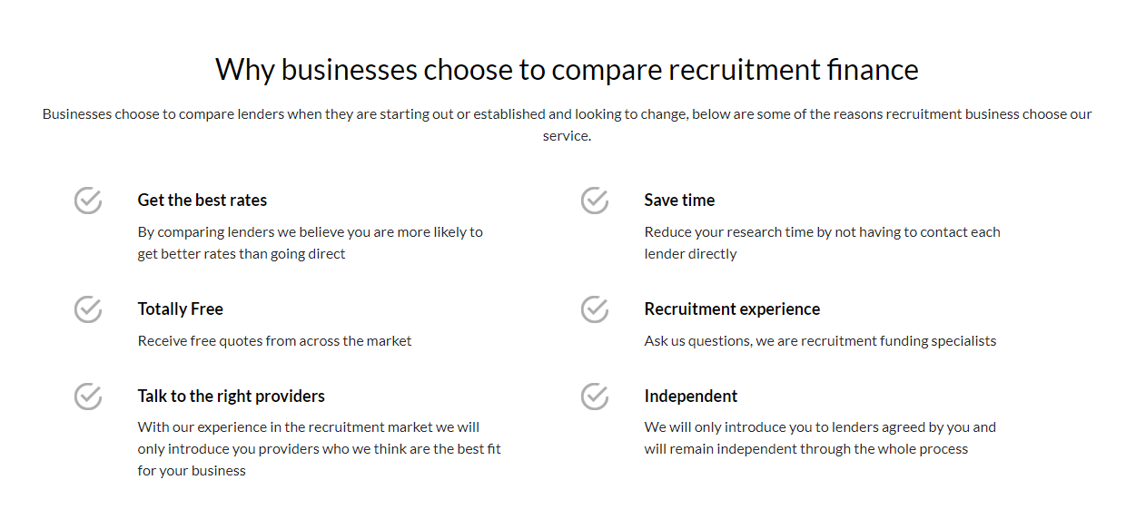 We provide a comparison service for all recruitment businesses. Any sector, any size – PAYE, umbrella, limited temps/contractors. We have a wide variety of lenders, some that can even fund pay when paid contracts RPOS and export customers!