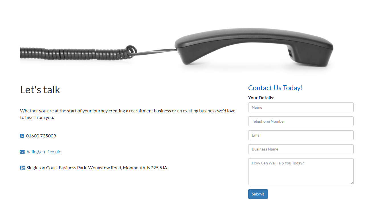 Based in Monmouth, South Wales (not far from Cardiff), CRF covers all of the UK recruitment market through phone and face to face meetings at your or our offices (the kettle is always on!!)