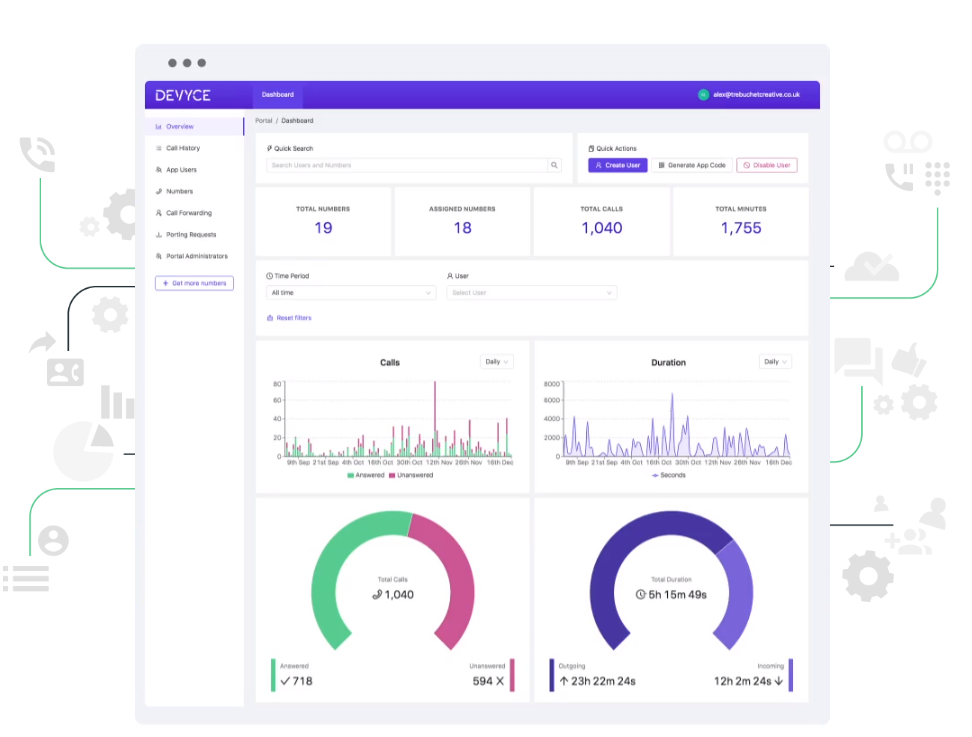 Devyce includes a Management Portal for our Teams and Enterprise customers. The Management Portal is where your account holder can allocate and deallocate numbers to employees and access key data metrics of call and messaging history.