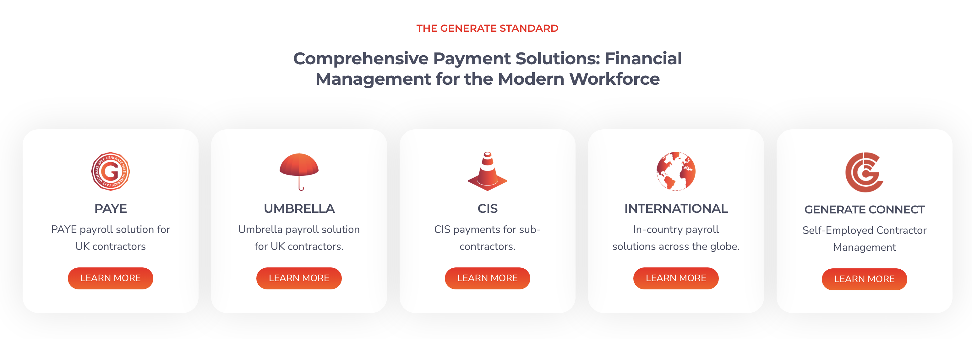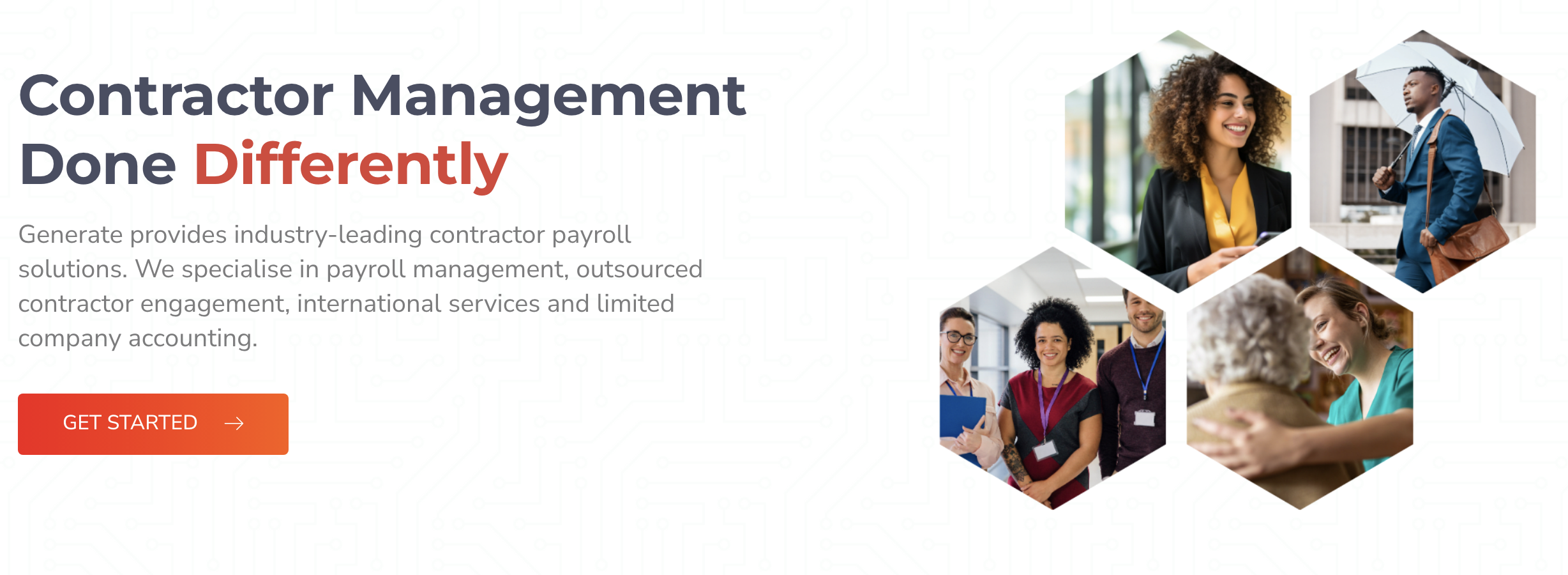 Generate provides industry-leading contractor payroll solutions. We specialise in payroll management, outsourced contractor engagement, international services and invoicing and payment services for all subcontractors, with optional accountancy management.