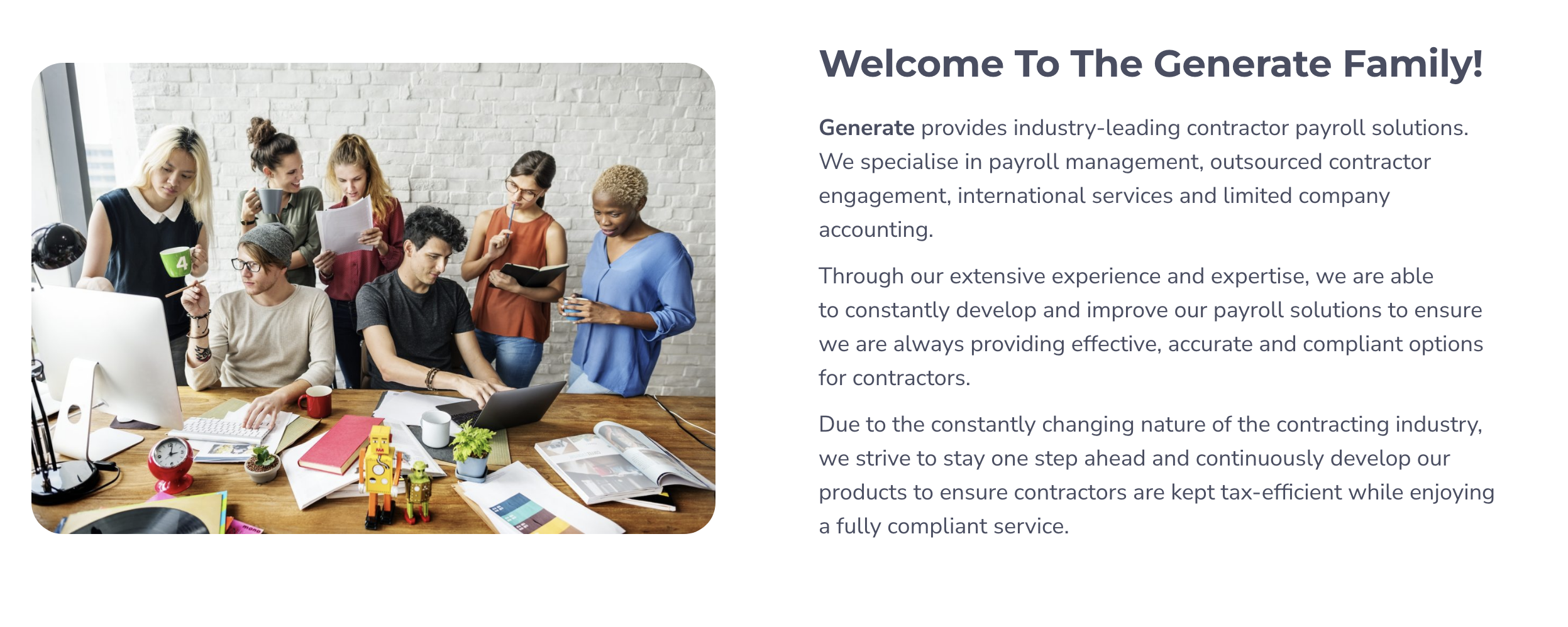 It is this drive and passion that has seen Generate rapidly grow and become one of the UK’s largest contractor services providers. Generate’s mission is to provide contractors with payroll solutions that are transparent, streamlined and compliant.