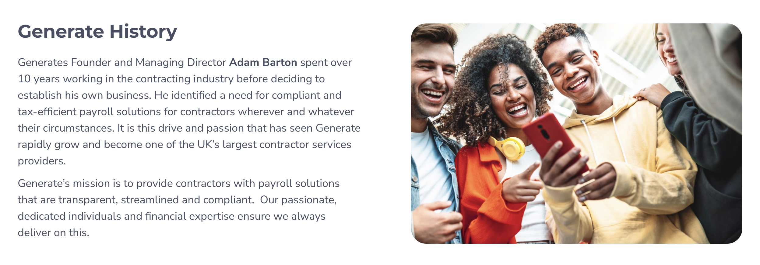 Generates Founder and CEO Adam Barton spent over 18 years working in the contracting industry before deciding to establish his own business. He identified a need for compliant and tax-efficient payroll solutions for contractors wherever and whatever their circumstances.