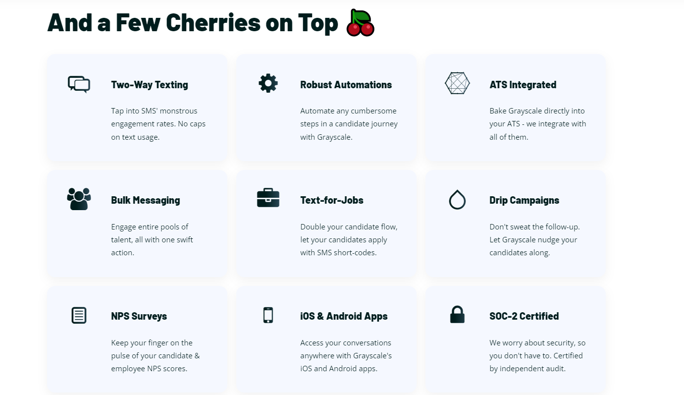 https://www.capterra.com/recruiting-software/#shortlist Grayscale is a texting and automation platform designed for modern hiring teams. Brands like Peloton, Wayfair, and DoorDash leverage Grayscale to text candidates and automate a high-touch candidate experience, all from inside their ATS.