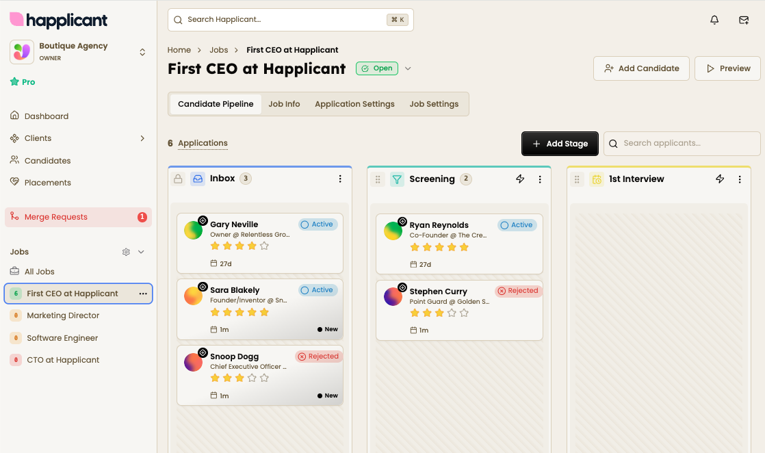 Happlicant is the all-in-one Applicant Tracking System (ATS) + CRM built specifically for recruiting agencies and solo recruiters who want to run a tighter, more profitable, and more human recruiting business.