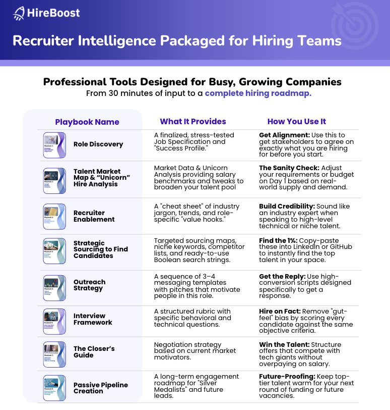 Born from the frustrations of a veteran executive recruiter who witnessed firsthand how inefficient hiring processes derail searches and lead to subpar hires, HireBoost provides the "Strategic Intelligence Layer" designed to fix the broken hiring cycle. It serves as Expertise-on-Demand for businesses tackling direct hiring with limited resources, transforming a recruiter from a novice to an expert on any specific role in under 30 minutes. By providing a comprehensive research framework on how to best find and assess talent, this solution sits between the job description and the search to provide the necessary context to hire better and faster.
