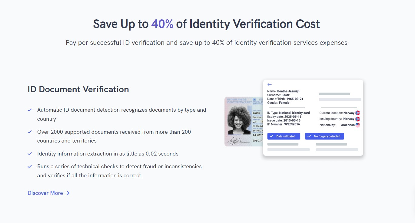 ☑️ Minimise user onboarding costs. Save more. Pay per successful ID verification. Save up to 40% of user onboarding costs. Increase the volume of quality customers by preventing fraudulent account. PRODUCT FEATURES