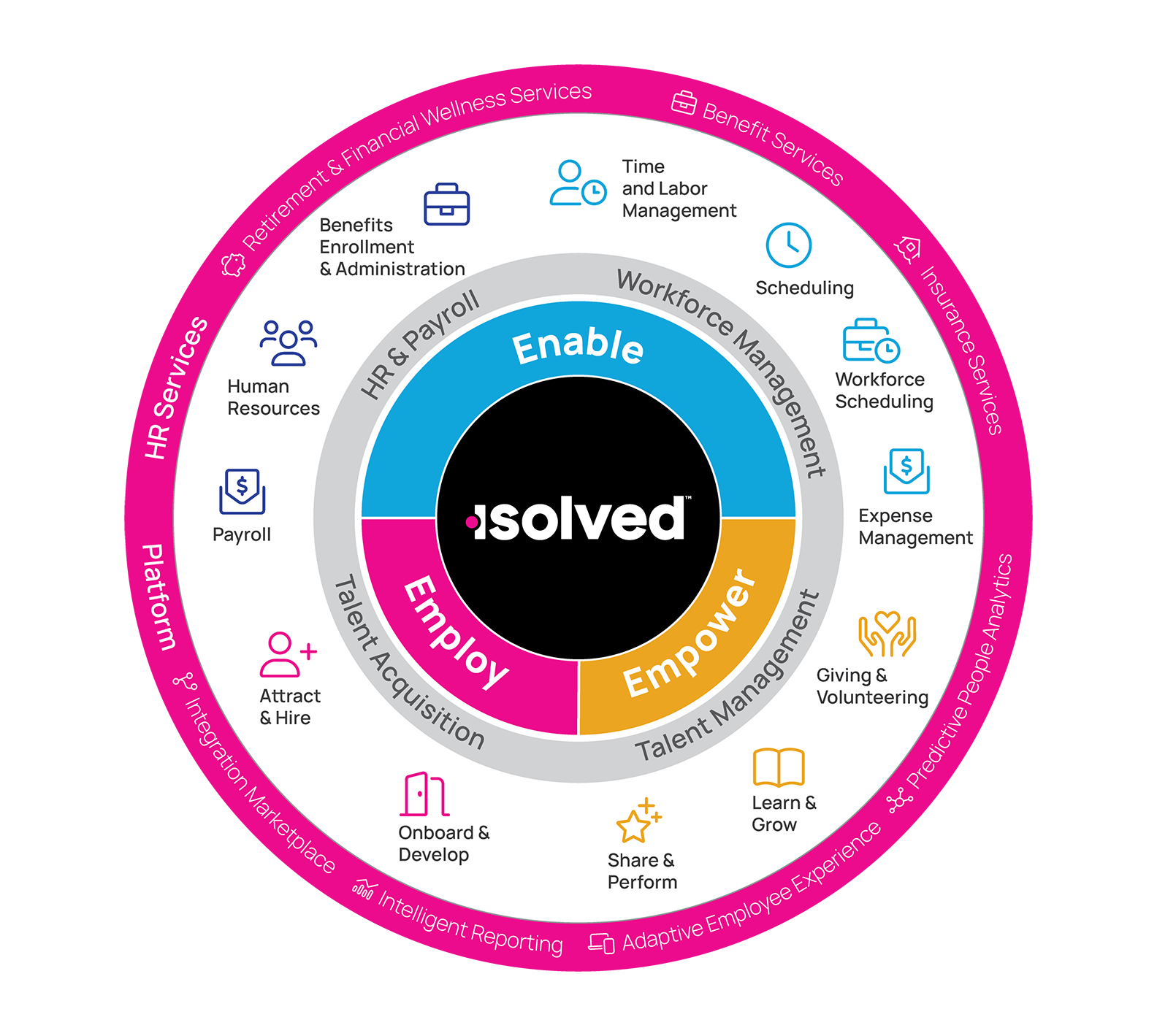 From talent acquisition to workforce management to talent management, our solutions are delivered directly or through our HRO partner network to more than 5 million employees and 145,000 employers across all 50 states – who use them every day to increase productivity, accelerate decision-making and ensure performance, while reducing risk. isolved People Cloud, our intelligently connected platform, automates the entire employee experience by design, so that organizations can engage, empower, and energize their talent while freeing their People Heroes to exceed their goals and grow their careers.