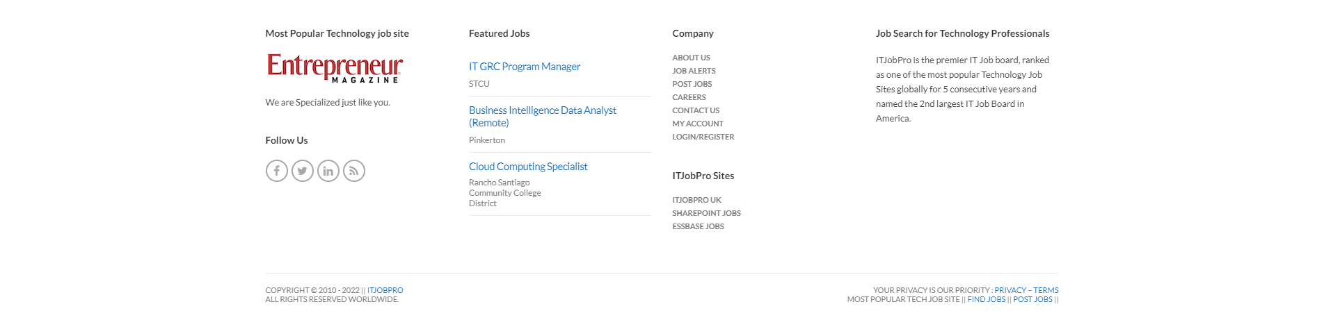 ITJobPro is the premier IT Job board, ranked as one of the most popular Technology Job Sites globally for 5 consecutive years and named the 2nd largest IT Job Board in America.