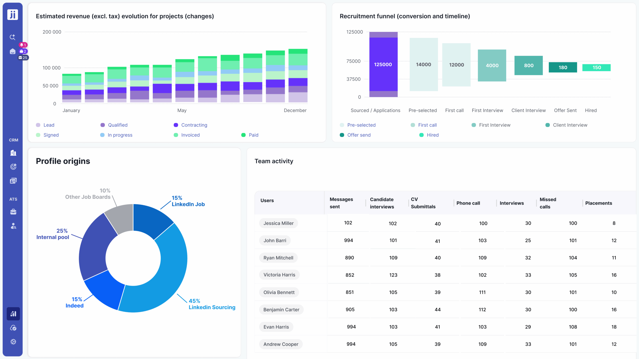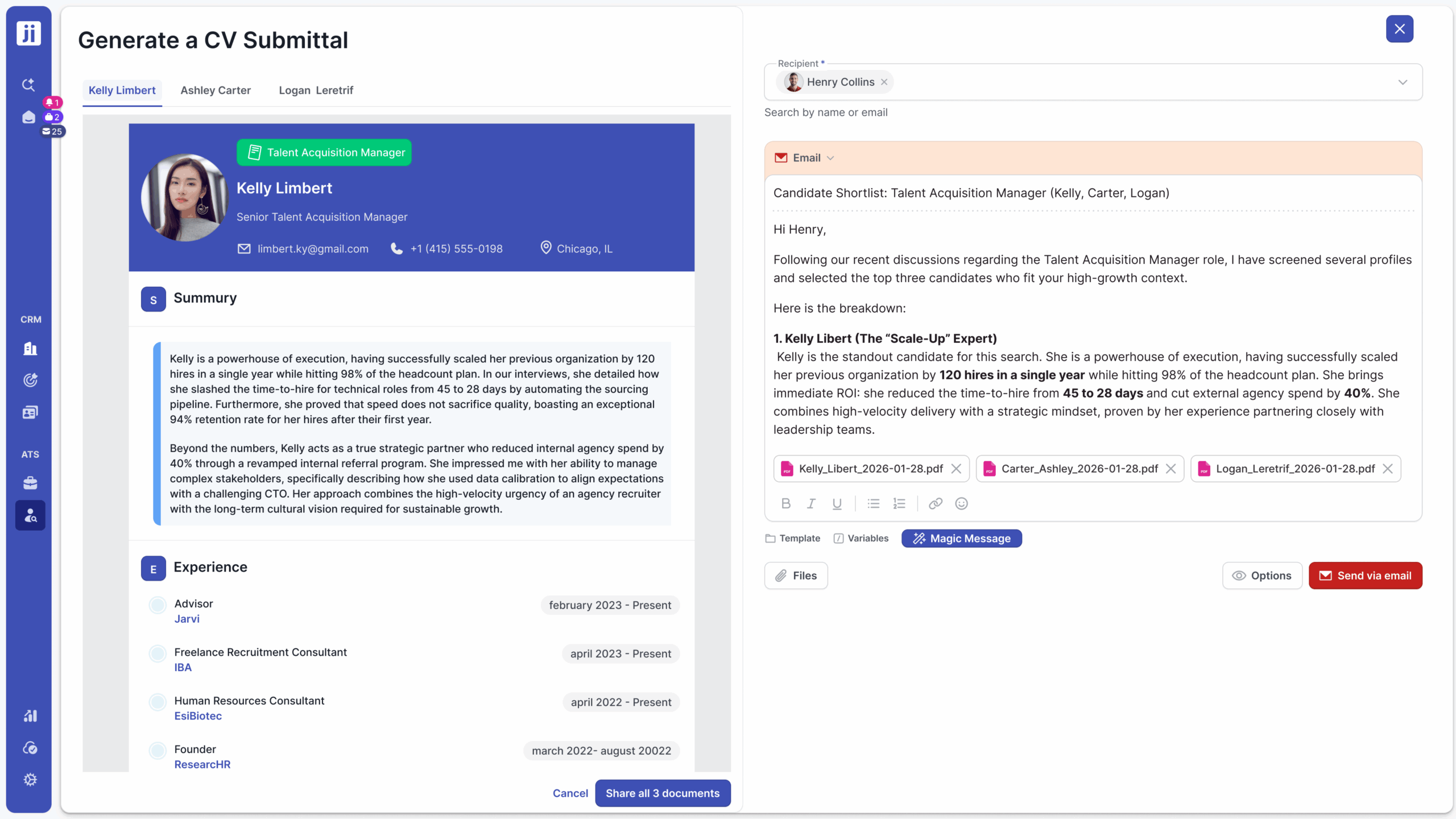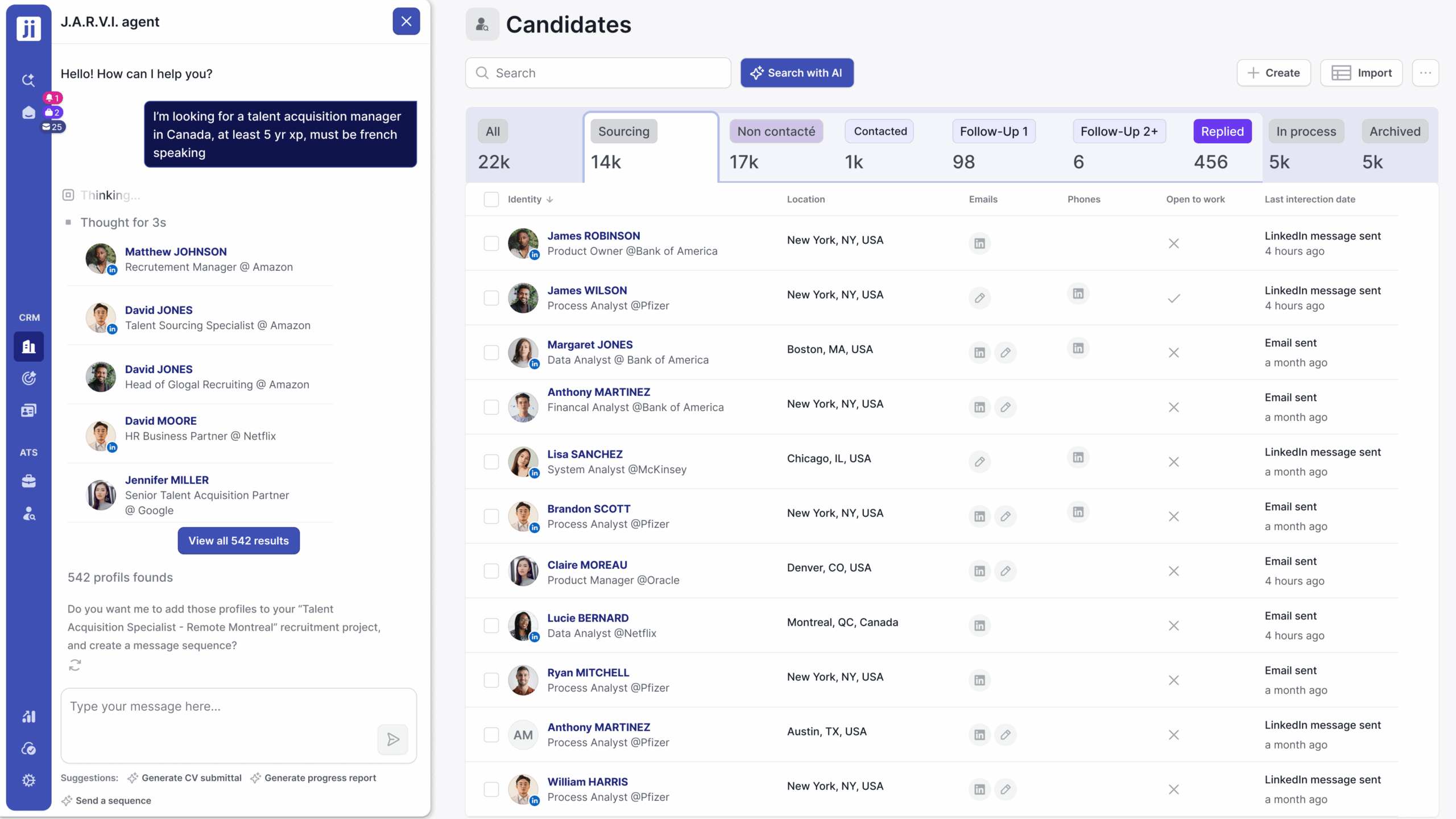 Let Jarvi handle data entry, follow-ups, and reporting while you build relationships and make placements. And much more.