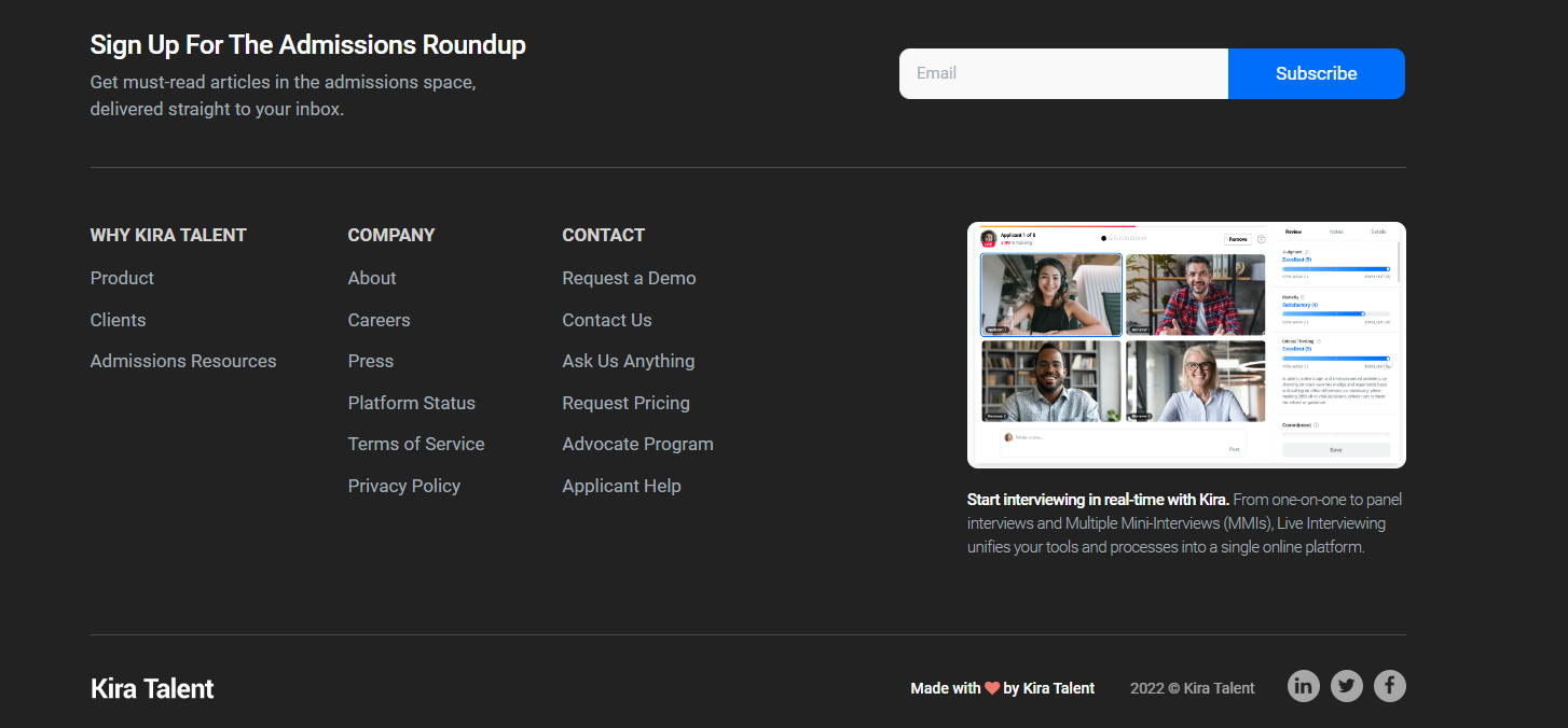 Kira enhances the existing application by integrating effective, efficient, and fair digital assessments into your school’s existing systems to create a more streamlined admissions process. Working at Kira: At Kira, we are solving complex problems in higher education by building elegant products that are easy to use.