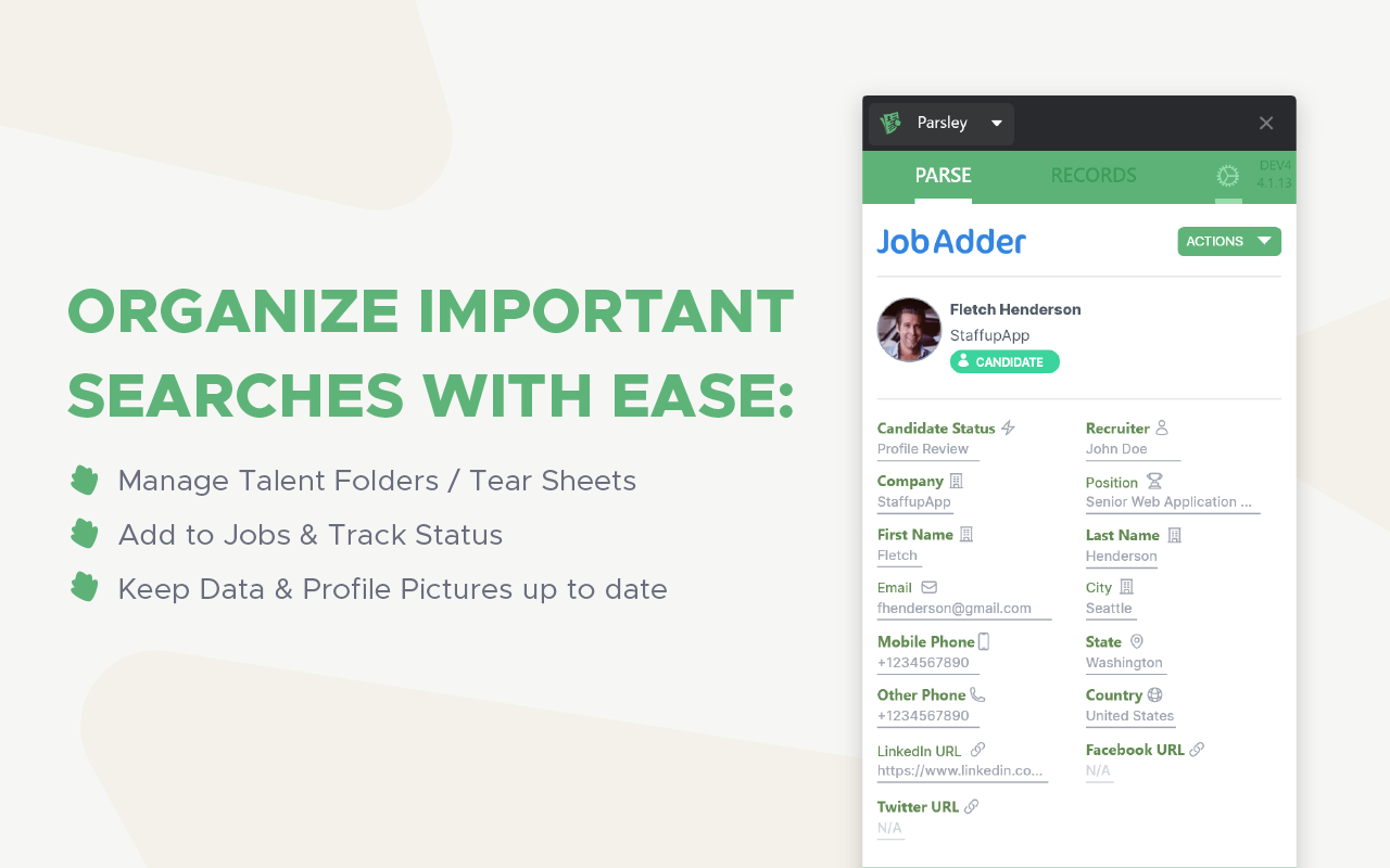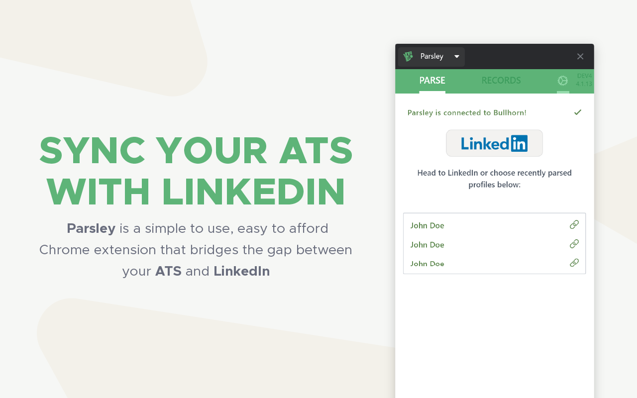 Parsley is the first Chrome Extension built exclusively for full desk recruiters & sourcing pros. Find Phone Numbers & Email Addresses, and Sync LinkedIn with Bullhorn or JobAdder.