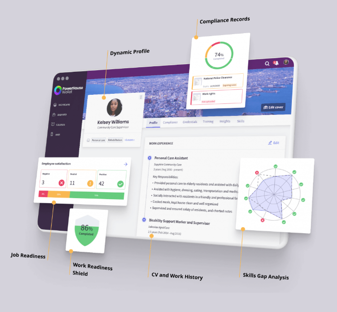 The Workforce Wallet Automated dynamic profile that is unique for each candidate or worker that records all data from the pre-screening, job readiness and appraisal workflows and generates a skills and compliance gap analysis. The platform manages compliance and job role upskilling with real-time visual reports and alerts.