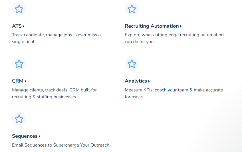 It offers drag-and-drop workflows, email and text messaging, API integrations, and ATS capabilities. It also encompasses advanced functionalities like candidate portals, company blocking, automatic email tracking, job board posting, built-in report analytics and more. With its G Suite and office365 integration, you can two-way sync emails to clients and candidates.