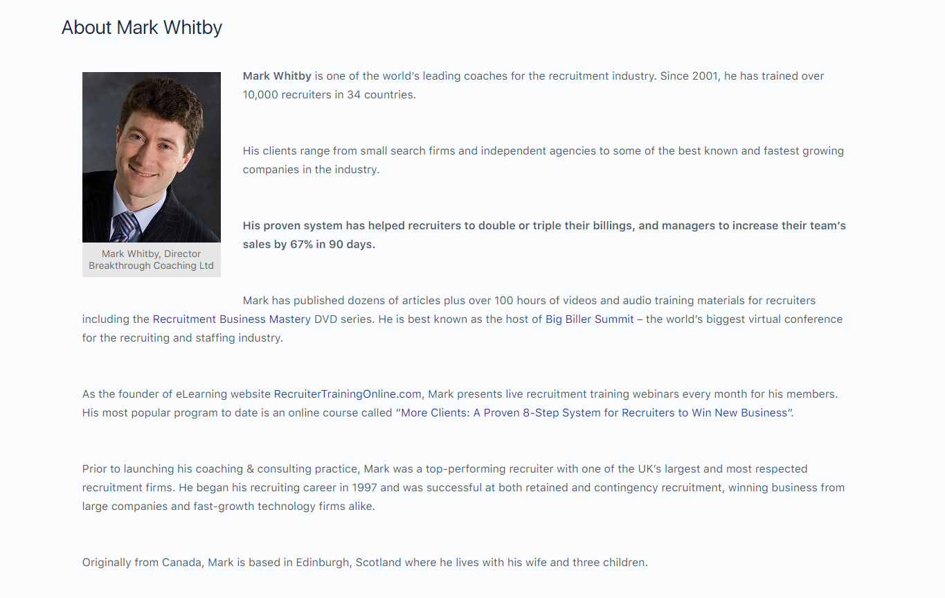 Mark is one of the world’s leading coaches for the recruitment industry. Since 2001, he has trained over 6000 recruiters in 34 countries.