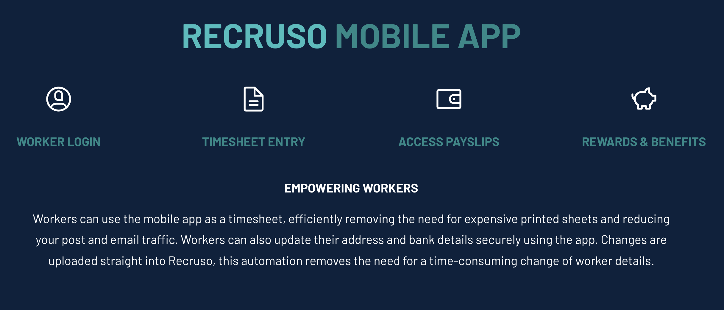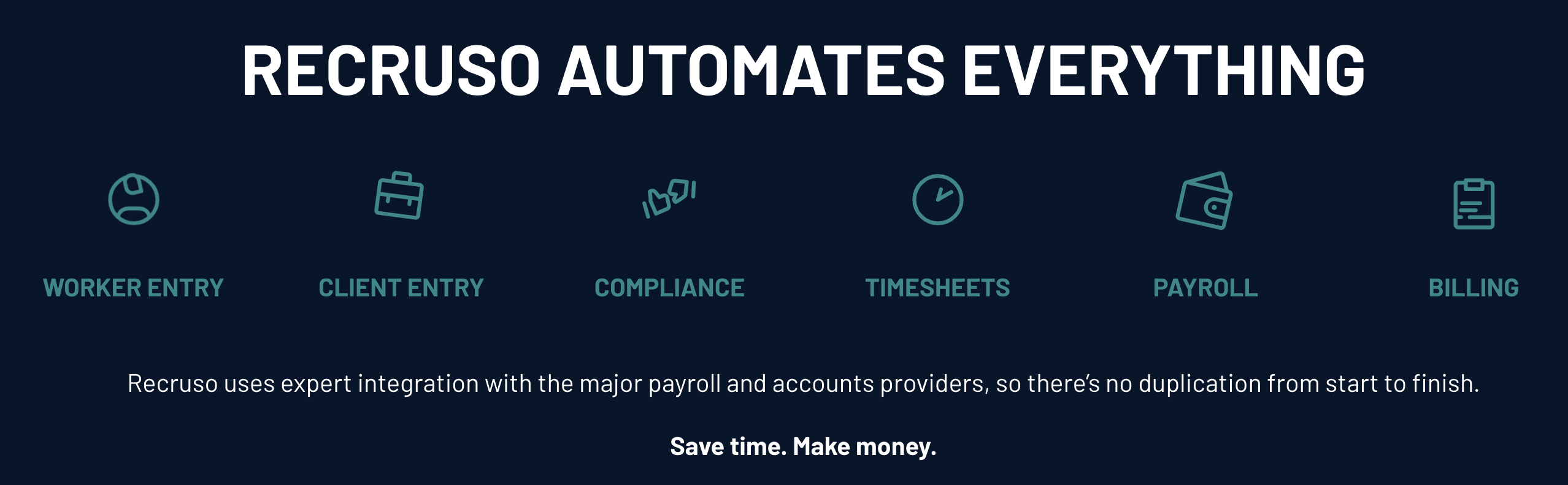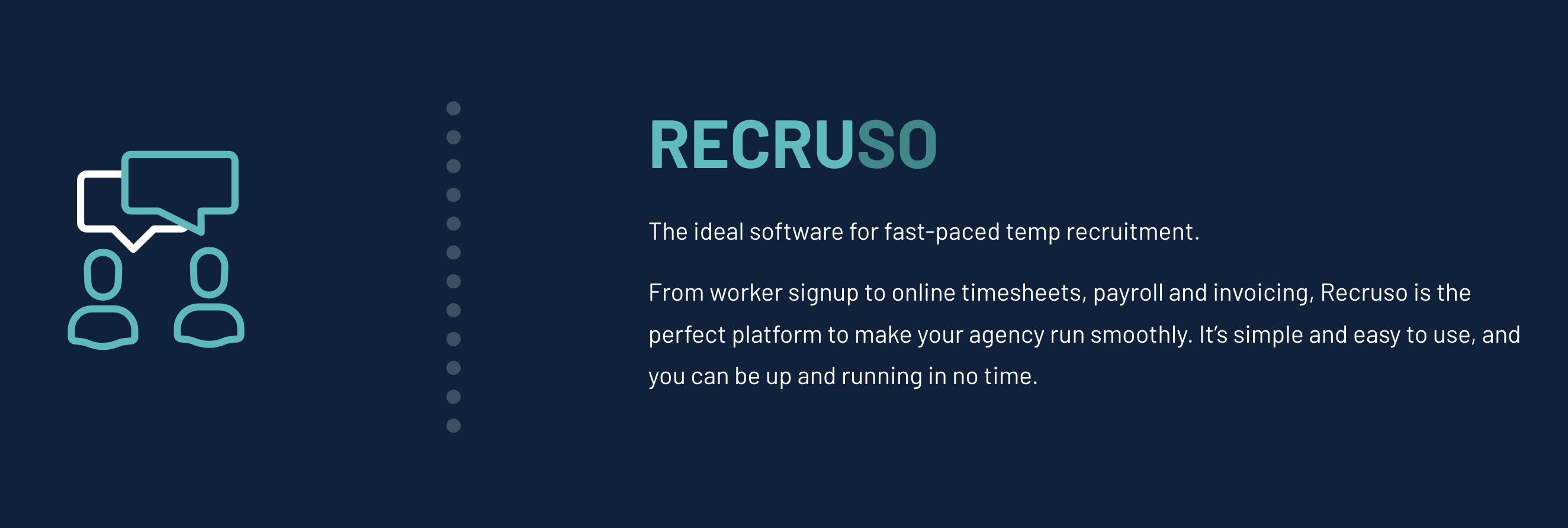 Whether you're a start-up or an established agency, Recruso equips you with the tools to automate your operations, ensuring you keep costs low while maximizing productivity. By blending the simplicity of manual systems with the power of online automation, Recruso has quickly become the go-to software for fast-paced, busy temp recruitment businesses across the UK.