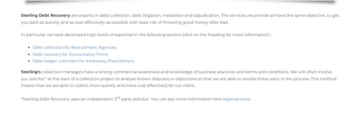 *Sterling Debt Recovery uses an independent 3rd party solicitor. You can see more information here legal services.