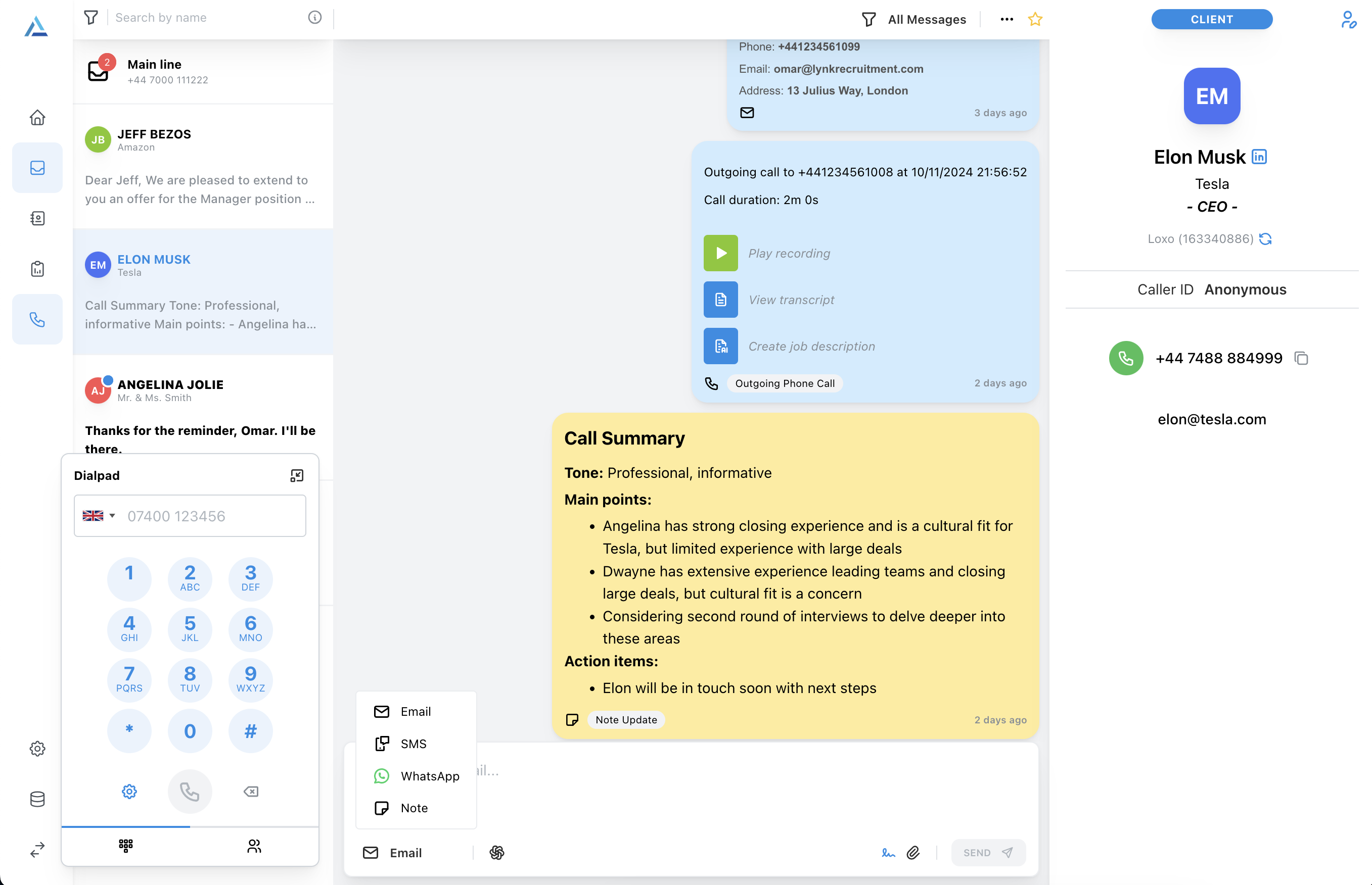 We work with recruitment agencies to centralise all their consultants' conversations so all data stays with the business instead of the individual or on personal mobiles. We provide Phone, MS Teams, WhatsApp, SMS, and Email services, all integrated into a single inbox that syncs with your CRM (Bullhorn, Vincere, Loxo, JobAdder, Mercury, Salesforce etc).