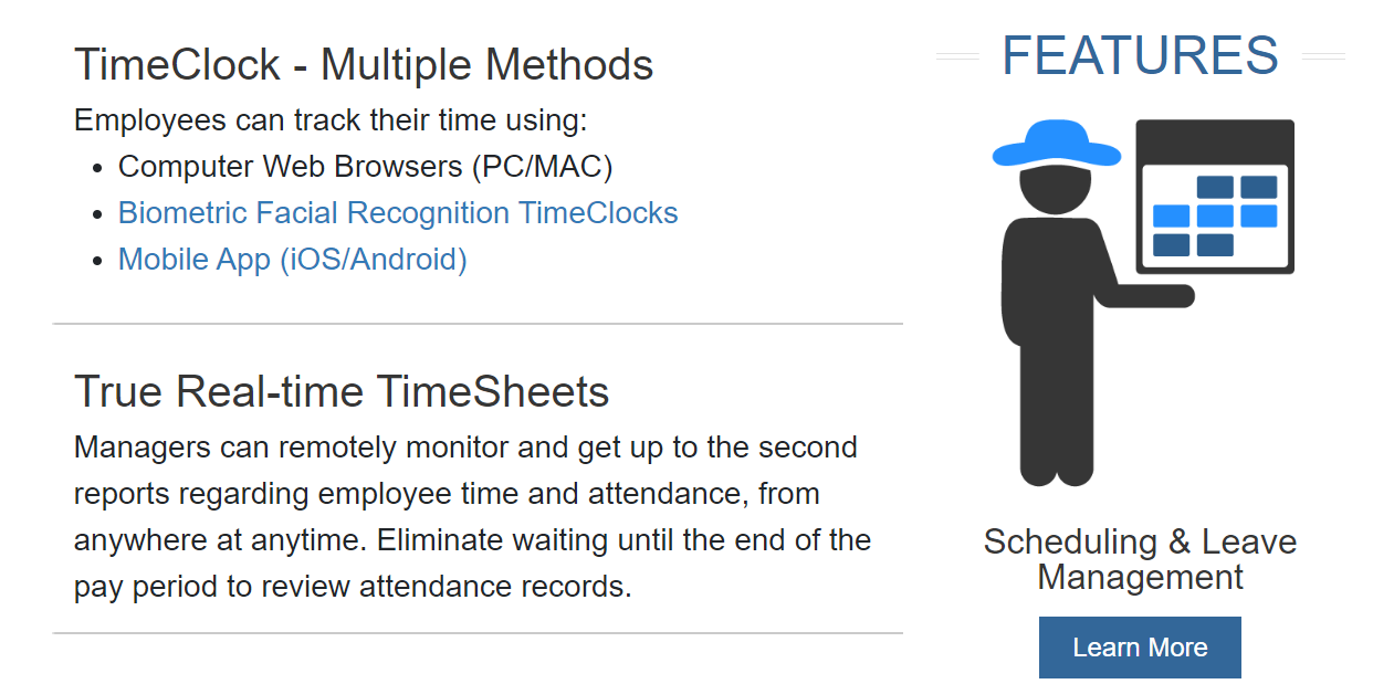 Managers can remotely monitor and get up to the second reports regarding employee time and attendance, from anywhere at anytime.